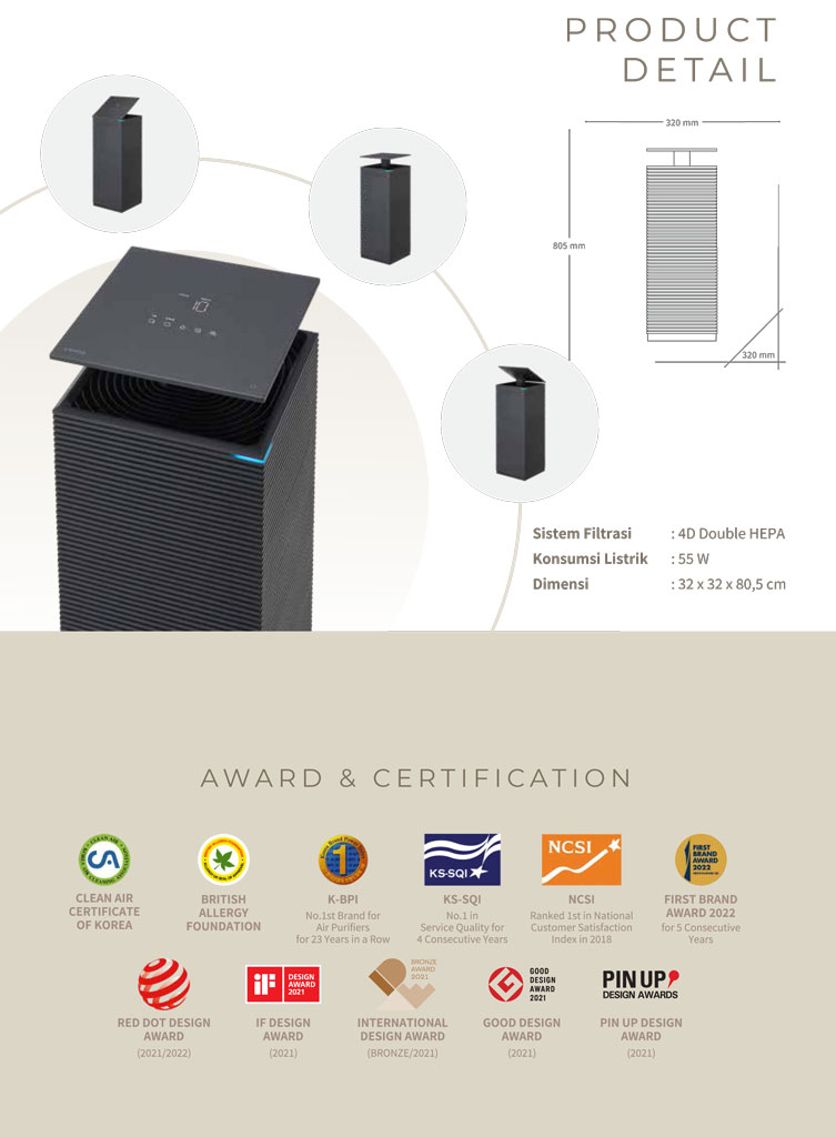 - Fine Dust Filter : Menghilangkan Secara Efektif Debu Halus pada Semua Tahap Filter HEPA.